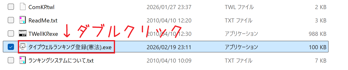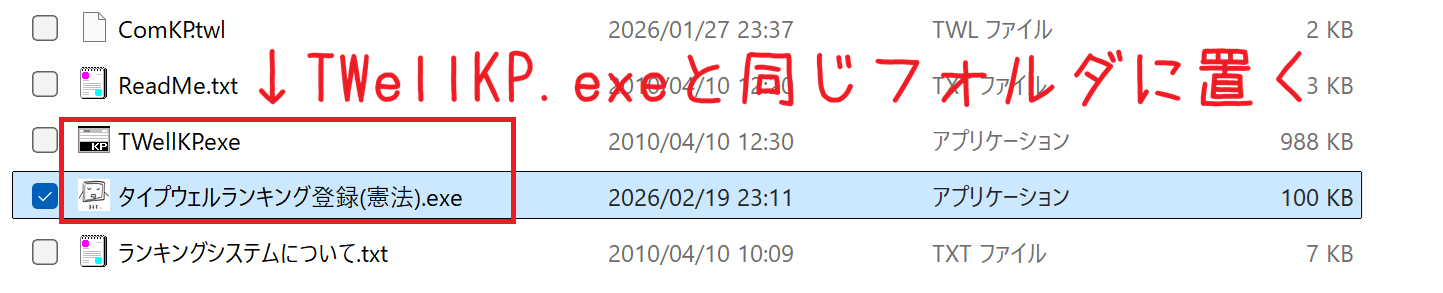 「タイプウェルランキング登録(憲法).exe」をタイプウェル憲法(TWellKP.exe)と同じフォルダにコピーして配置