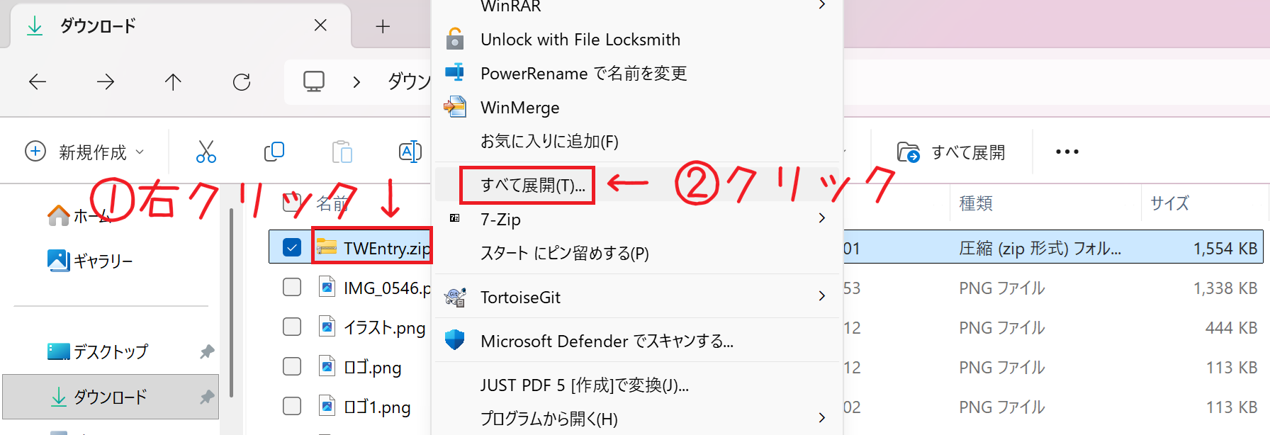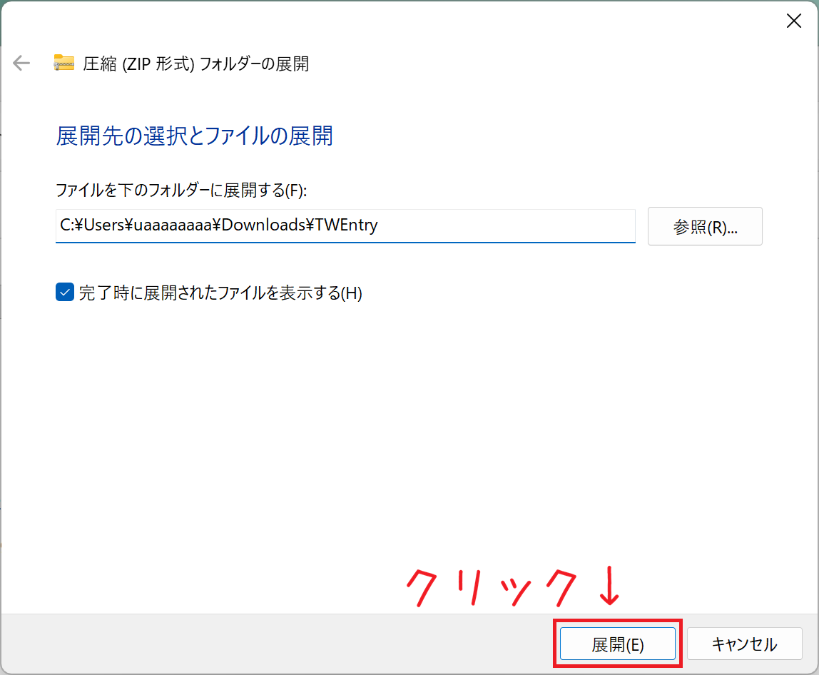ダウンロードしたファイル「TWEntry.zip」を右クリック → 「すべて展開(T)…」をクリック